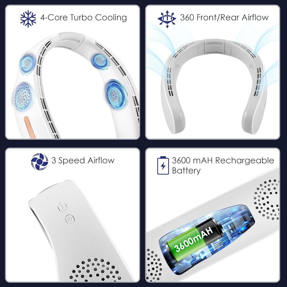 Stay cool and composed anywhere with this hands-free wearable cooling system. Its quad-turbo motors provide a full 360-degree breeze, making it the perfect companion for active days and hot commutes.